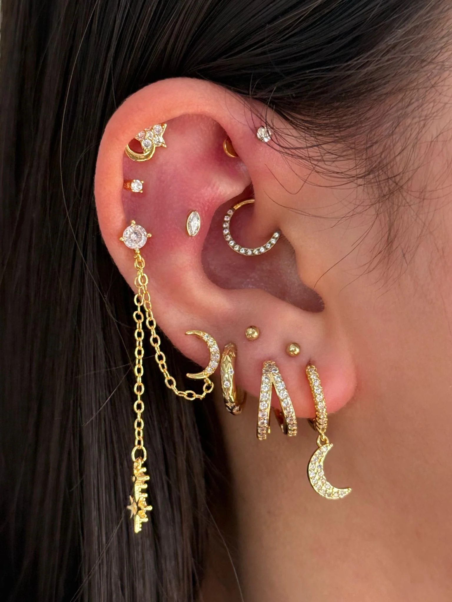 The Gold Moon and Star Huggies are stylish and versatile gold-plated earrings designed to add a chic touch to your everyday or special occasion looks. These huggies offer a sleek and minimalistic design, perfect for pairing with various outfits, from casual to formal, making them a must-have accessory.