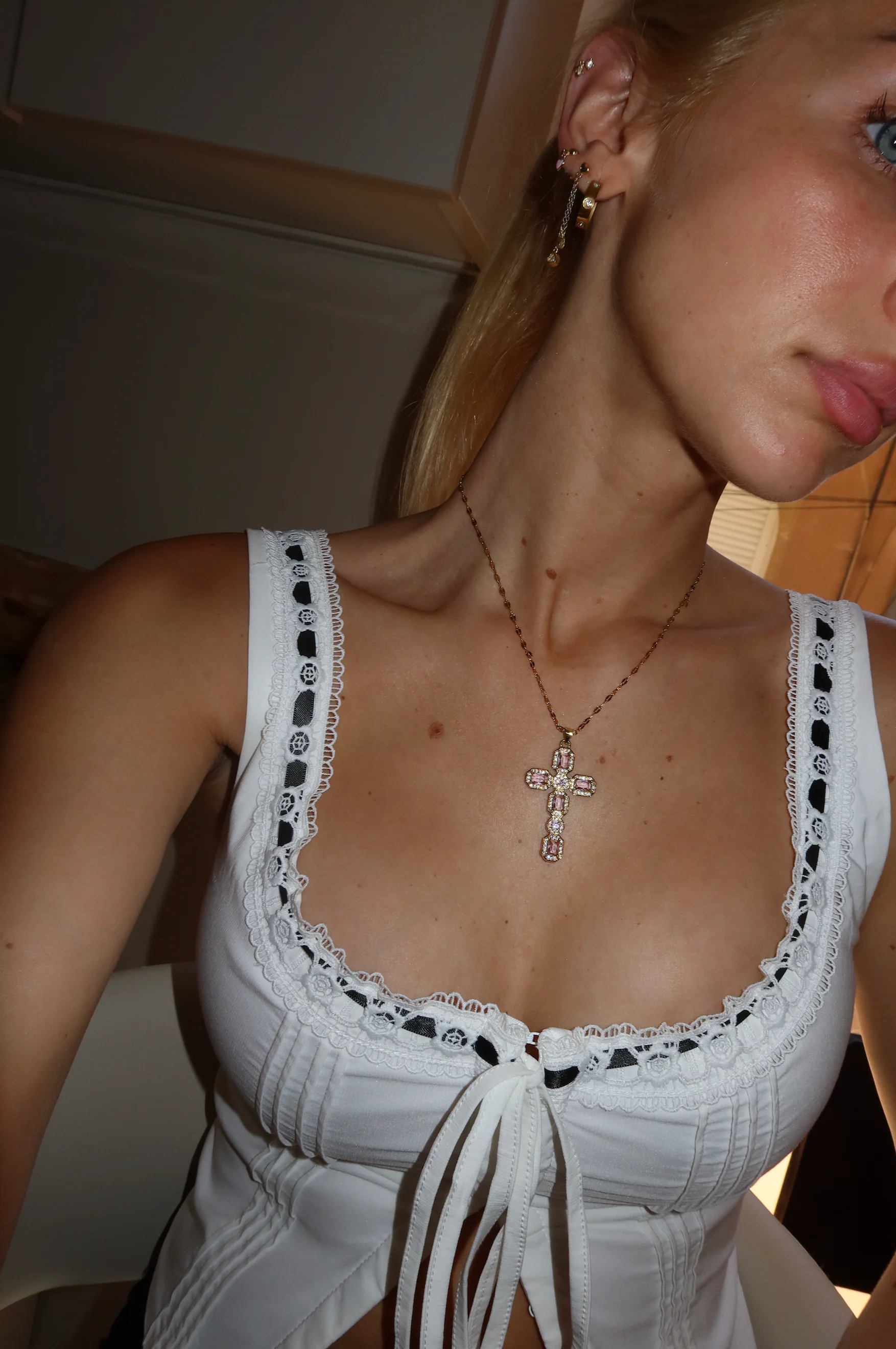 Add a charming touch to your jewellery collection with the Silver Baby Pink Cross Necklace! This delicate silver-plated necklace features a baby pink cross pendant, making it the perfect accessory to add a soft, feminine vibe to any outfit. Whether you're layering it with other pieces or wearing it solo, this necklace brings a subtle yet meaningful statement to your style.